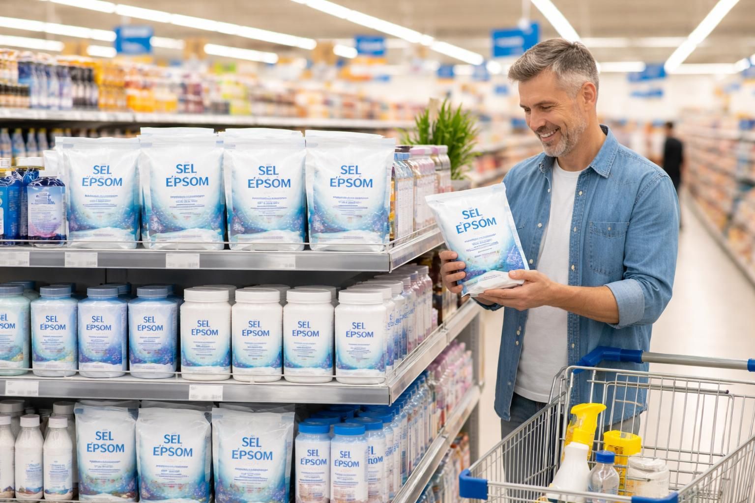 Dans les hypermarchés, le sel d’Epsom est le plus souvent situé dans le même rayon que les produits ménagers. Recherchez-le près des lessives ou du percarbonate de sodium. Néanmoins, il convient de noter que de nombreux magasins n’ont pas tendance à stocker ce produit de façon régulière, en raison d’une demande moins constante par rapport à d’autres produits.
